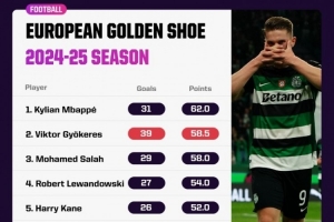 九游体育官网-本赛季欧洲金靴积分:约克雷斯仅次姆巴佩,萨拉赫&莱万&凯恩在列
