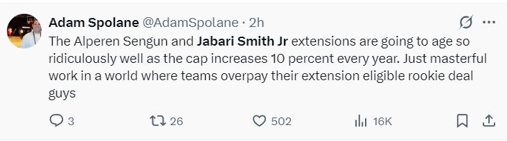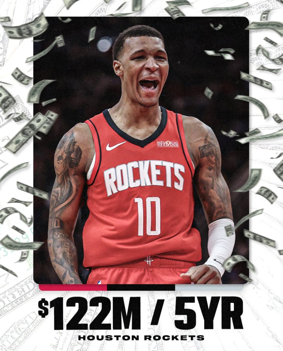 薪资结构专家Yossi Gozlan写道,小贾从一个不太可能提前续约的球员,最终获得均薪2440万的五年合同,这份合同只占工资帽12.7%与麦克丹尼尔斯的类似,火箭对他表达了极大的信任,以此来支持他们冲击总冠军。