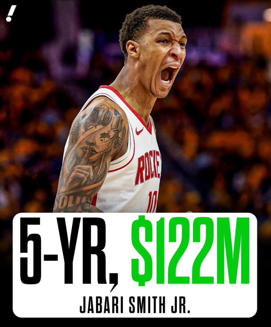 小贾巴里-史密斯与休斯顿火箭队达成提前续约,这份合同为五年1.22亿,合同不包含球员选项与球队选项,而且这五年是全额保障,26-27赛季2103万、27-28赛季2271万、28-29赛季2440万、29-30赛季2640万、30-31赛季2776万。