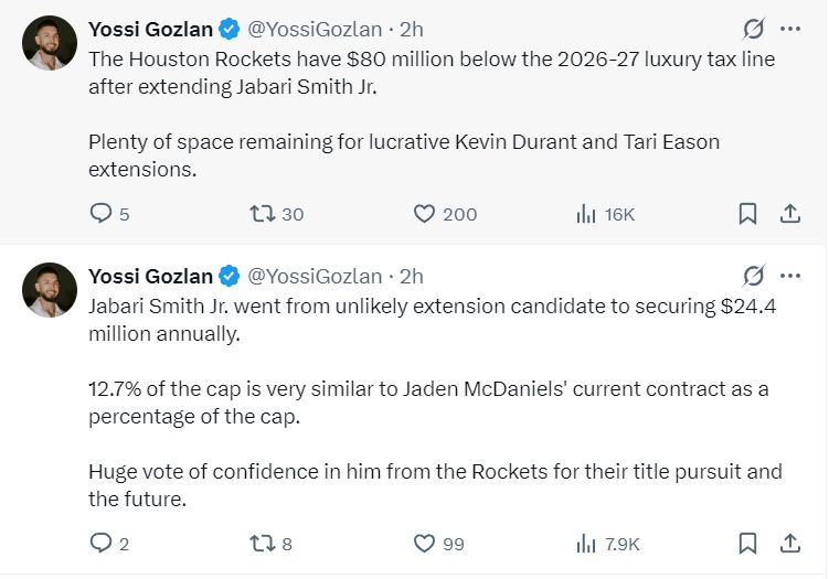 小贾在续约后,火箭队在26-27赛季的薪资处于奢侈税线下8000万,这让火箭队有足够的空间来续约杜兰特、伊森,这两人都可以获得丰厚回报。